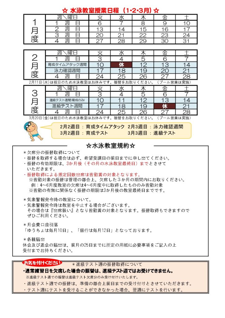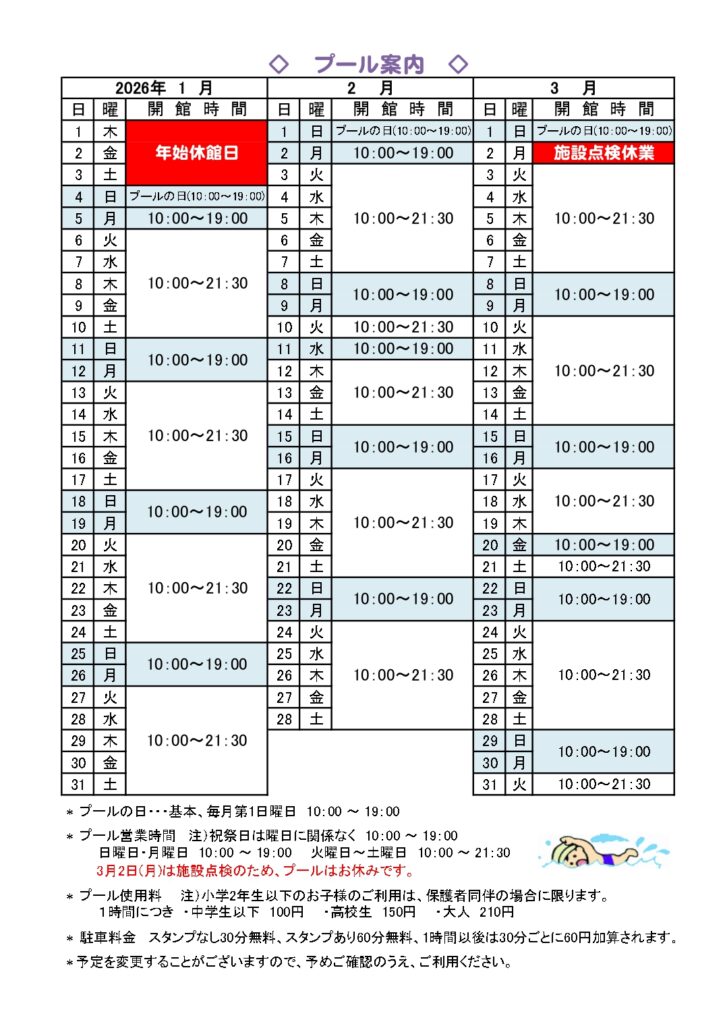◆2026年1月~3月の水泳教室だよりができました。水泳教室やプール営業日程はこちらよりご確認をお願いいたします。